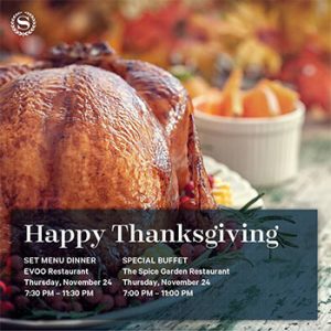 Thanksgiving Dinner at Sheraton Hotel, Amman Set Menu Dinner @ EVOO Restaurant Thursday, November 24, 2016 - 7:30 PM - 11:30 PM Or A Special Buffet Dinner @ The Spice Garden Restaurant Thursday, November 24, 2016 - 7:00 PM - 11:00 PM Enjoy a lavish Thanksgiving feast with your loved ones at Sheraton Amman Al Nabil. Also; for Turkey to go place your order and call at 065934111 ext. 5378