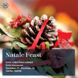 Natale Evoo Christmas Feast @ Sheraton Amman Al Nabil Hotel from December 17 till 24, 2016 - 7:30pm till 11:30pm Rejoice with festive tunes and join us at EVOO for a special Christmas menu. Be merry with your loved ones and take in the festivities. For reservation please call us at 065934111