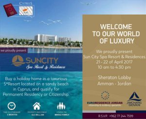 نقدم لكم وبكل فخر منتجع وفندق سن سيتي - نتشرف بحضوركم للعرض التقديمي في فندق الشيراتون / عمان في 21 و 22 نيسان من الشهر الحالي نستقبلكم ما بين الساعة العاشرة إلى الرابعة والنصف مساءا من يومي الجمعة والسبت. أهلا وسهلا بكم