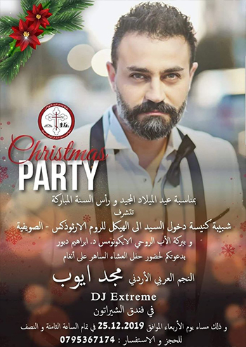 المسيح ولد فمجدوه بمناسبة حلول عيد الميلاد المجيد و رأس السنة الجديدة تتشرف شبيبة كنيسة دخول السيد الى الهيكل للروم الأرثوذكس - الصويفية وببركة الأب الروحي الايكونومس د. ابراهيم دبور بدعوتكم لحضور حفل العشاء الساهر على أنغام DJ Extreme النجم فارس العبدالله و النجم توفيق الدلو في فندق الشيراتون و ذلك مساء يوم الاثنين الموافق 25/12/2017 في تمام الساعة الثامنة والنصف للحجز والاستفسار : 0795367174 و كل عام وانتم بخير