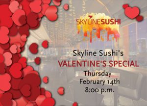 Join us at Skyline Sushi for an unforgettable night, as we celebrate Valentine's this year! Starting 8:00 p.m., DJ Murrad will be playing the best music for you. For only JD30++ per person, you will get an absolutely mouth-watering meal. Starting with some soup, an appetizer, salad, an exquisite Sushi boat, and let's not forget some delicious dessert! Book your table now by calling 079 833 1313!
