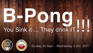 B-PONG You Sink it ... They drink IT!!! Beer Pong tournaments will take place on the below dates: • Sunday 24 Sept. 2017 • Tuesday 26 Sept. 2017 • Sunday 1 October 2017 • Tuesday 3 October 2017 Playing the Game Beer Pong is played by teams of two in which each team takes turn throwing a table tennis ball into the other team's cups. Once a ball lands in a cup, the cup is taken away and the opponent …